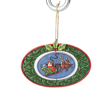 This Jim Shore basket with holly leaves and berries handle features Santa and his reindeer flying above a fresh fallen snow covered forest. With th...