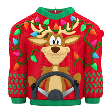 Speed into holiday fun with this hilarious Christmas tree ornament that features an ugly sweater design with a mischievous reindeer at the helm of ...
