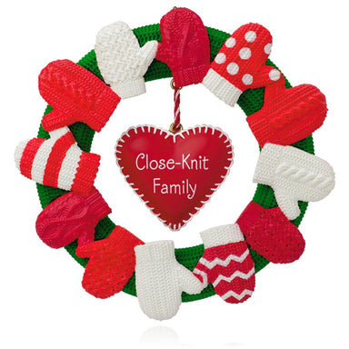wreath of mittens surround a hanging heart that is inscribed with Close-Knit Family