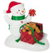 Get wrapped up in the holiday spirit with this cute Christmas tree ornament. A snowman dressed in a Santa hat and green scarf wraps a present in red plaid paper, green ribbon and a red bow with the